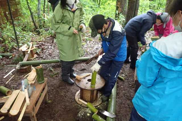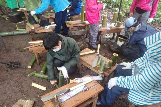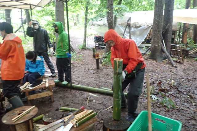 ノコギリで竹を切り、ナタで割って、ナイフで成形していきます。