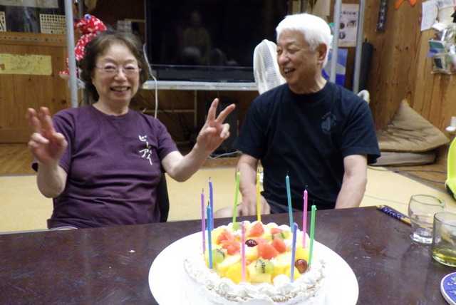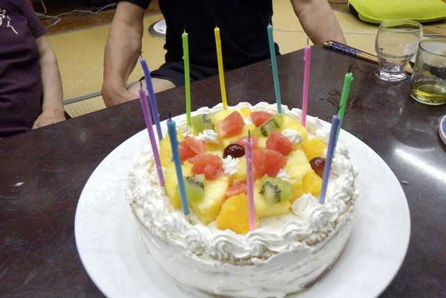 母の誕生日なので、かみさんがケーキを焼いて、娘が飾り付けをしてくれた。