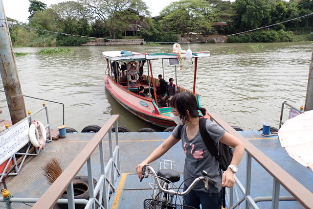 先端だけ乗り付けて、自転車も人も乗り降りをする。