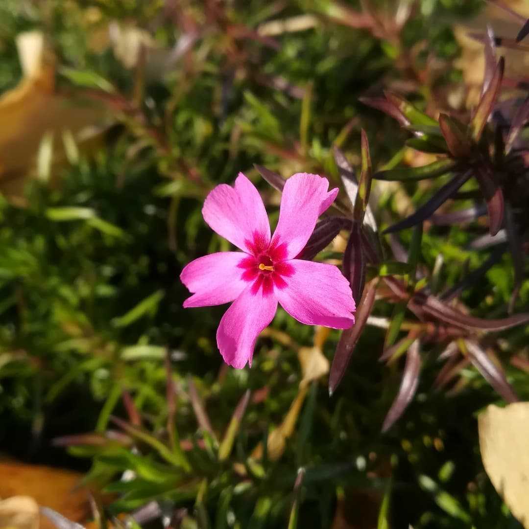 🌼 #芝桜の花読みは、シバザクラです。北米 原産ハナシノブ科 フロックス属の多年草。匍匐性が強く、地面に芝の様に拡がり、春頃に桜に似た5花弁のお花を一面に咲かせます。満開時のお花の絨毯は圧巻です。常緑で耐寒性も高く乾燥にも強いので、グランドカバーとして、芝生の様に植えられます。但し芝程に踏圧に強く無いので踏まれない場所に限られます。#芝桜 #シバザクラ別名#花詰草 #花爪草 #ハナツメクサ#モスフロックス学名#phlox_subulata英名#moss_phlox冬ではあるのですが芝桜がポチポチと咲いておりました。葉が紅葉しておりますね。花期は、04月〜05月 頃春に咲くお花です。