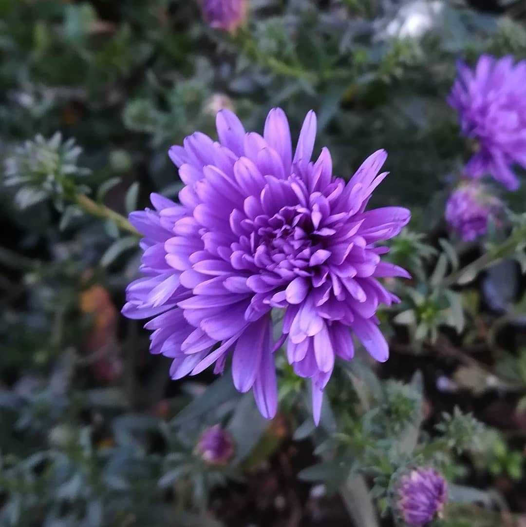 🌼 #宿根アスターの花読みはシュッコンアスターです。アジア、欧州、北米 原産キク科 シオン属常緑多年草観賞用に栽培されるシオン属の総称。日本のシオンや野紺菊等も広義では宿根アスターに含まれます。アジア、欧州、北米、等に約152種が存在し、180cmを超える高性種から、30cm前後の矮性種まで、様々の種が存在します。#宿根アスター #シュッコンアスター別名#孔雀アスター #クジャクアスター学名#aster_cv英名#michaelmas_daisy駅前の寄植えにて紫のお花で揃えておりまして、その中の一つです。花期は、09月〜11月 頃秋に咲くお花ですね。