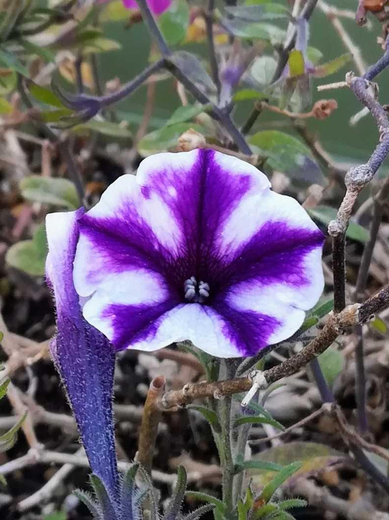🌼 #ペチュニアの花南米 原産ナス科 ペチュニア属の 多年草。(但し、寒さに弱く、日本では一年草扱いとなります。)園芸品種で、膨大な種類のお花があります、特に日本では盛んに品種改良が行われており、今現在もドンドン増えています。ペチュニアとは現地の言葉でタバコの事だそうです、この植物がタバコと言う訳では無く、花が似ているのでこう呼ばれていただけの様です。#ペチュニア別名#衝羽根朝顔 #ツクバネアサガオ学名#Petunia_x_hybrida英名#petunia紫色に白斑のペチュニアです。鉢植えでしたが、寒いのに頑張って咲いておりました。花期は、03月〜11月 頃までほぼ、冬以外ですね。