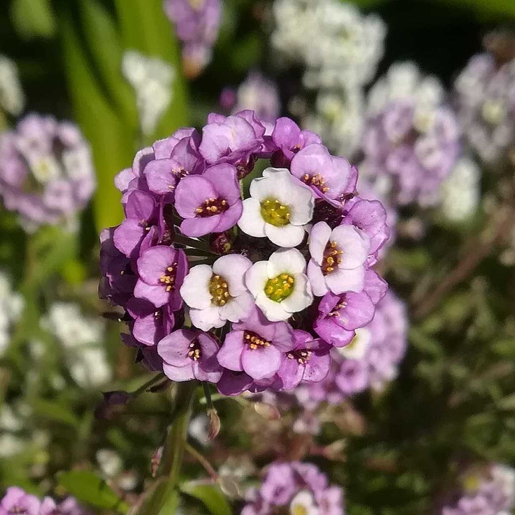 🌼 #アリッサムの花 地中海沿岸 原産アブラナ科 ロブラリア属の多年草。ぺんぺん草ことナズナの仲間です。園芸品種ではスイートアリッサムとして流通しています。耐寒性が高く、冬でも元気に咲くので花壇の寄植え等に良く使われますね。しかし反面、多湿を苦手としており梅雨時に枯れてしまう為、一応多年草ではありますが、一年草の植物として扱われます。#アリッサム#スイートアリッサム別名#庭薺 #ニワナズナ#ロブラリア_マリティマ学名#lobularia_maritima英名#alyssum#sweet_alyssum#sweet_alison#seaside_loburaria 白と紫色のアリッサムです。お庭の花壇に植えられてありました。花期は、10月〜04月 頃秋から春まで咲くお花です。