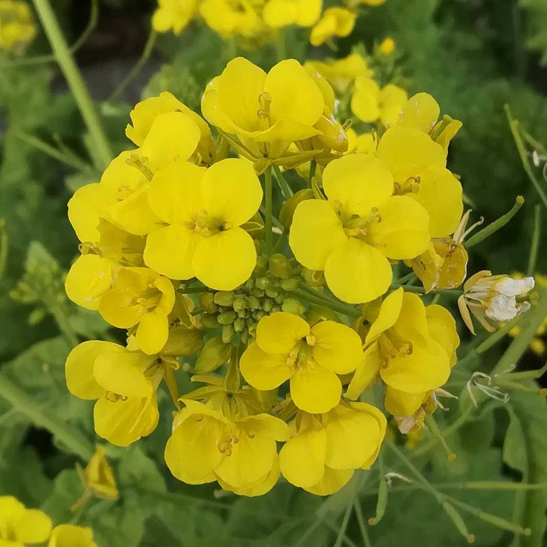 🌼 #西洋油菜の花読みは、セイヨウアブラナです北欧州 原産アブラナ科 アブラナ属の越年草。いわゆる菜の花ですね。日本在来種の油菜とは別種で、染色体の数が全然違うのだそうです。在来種との違いは葉の生え方で、西洋油菜は茎に葉を取り巻く様に生えます。葉は、ボコボコのシワシワで白菜に似た質感ですね。種の色も、在来種は赤茶色ですが西洋油菜は真っ黒です。#西洋油菜 #セイヨウアブラナ別名#菜種 #ナタネ#西洋菜種 #セイヨウナタネ#黒種 #クロダネ学名#brassica_napus 英名#rapeseed#rape_colza#rapa河津桜の根本に植え込まれた菜の花ですが、河津桜の咲く前に満開になる勢いで咲いておりました。花期は、03月〜05 月 頃春のお花ですね。