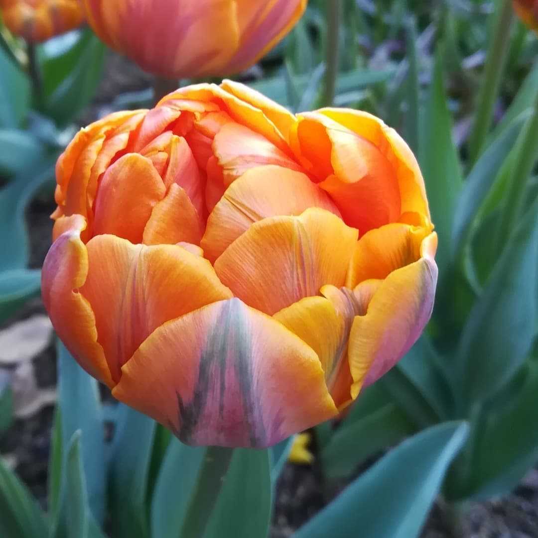 🌼 #チューリップの花中央アジア 原産ユリ科 チューリップ属の多年草。歴史も古く人気の高い球根植物で5000種を超える品種が登録されていて、更に増え続けております。球根の分球にて増やしますが、種子からも育てられるそうです、しかしその場合はお花を咲かせるまでに5年以上掛かるそうでして、分球の方が断然お手軽ですね。和名は鬱金香(ウコンコウ)あまり聞かない名前ですが、お花の香りが鬱金〈ターメリック〉に似ている事に由来するそうです。ピンと来ませんが、埃臭いと云う事だそうですよ。#チューリップ別名#鬱金香 #ウコンコウ #ウッコンコウ学名#tulipa英名#tulipかかりつけの病院の前庭の花壇に植わっておりました。オレンジ色で横広で丸いチューリップさんです。花期は、03月〜05月 頃早春から梅雨時まで咲くお花です。基本的に春咲きのお花でありますが開花期を調整した園芸品種も多く秋過ぎ頃には観られる様になりました。