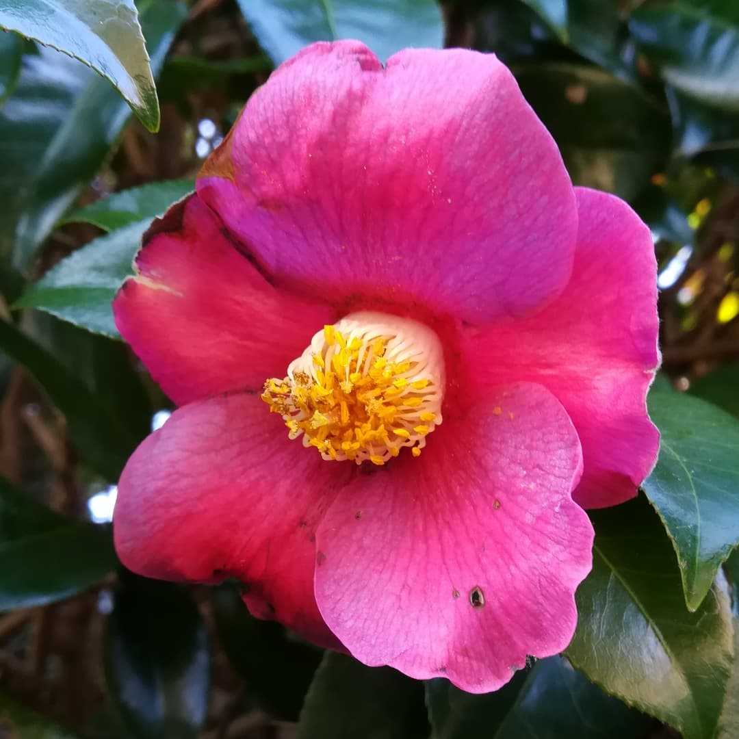 🌼 #椿の花読みはツバキです。東アジア 原産 ツバキ科 ツバキ属 の 常緑広葉樹。藪椿の通称、及び雪椿より作り出された園芸品種の総称。近似種の山茶花は椿には含まれず独立して分類されています。山茶花と異なる特徴として、雄蕊が筒状に纏まり、根本では一つになっています。また花弁は散り難く、落ちる時は花頭部ごと纏めて落ちます。この辺の特徴から、首が落ちると例えられていて、日本に於いては縁起の良く無いお花とされ、贈り物や仏前にお供えしてはダメなお花になっております。綺麗に咲いたからと、プレゼントにしない様にしましょうね。#椿 #海柘榴 #ツバキ別名#藪椿 #ヤブツバキ学名#camellia_japonica英名#camellia森に自生していた藪椿です。今年は早い開花ですね。花期は、02月〜04 月 頃冬から春に咲くお花ですね。