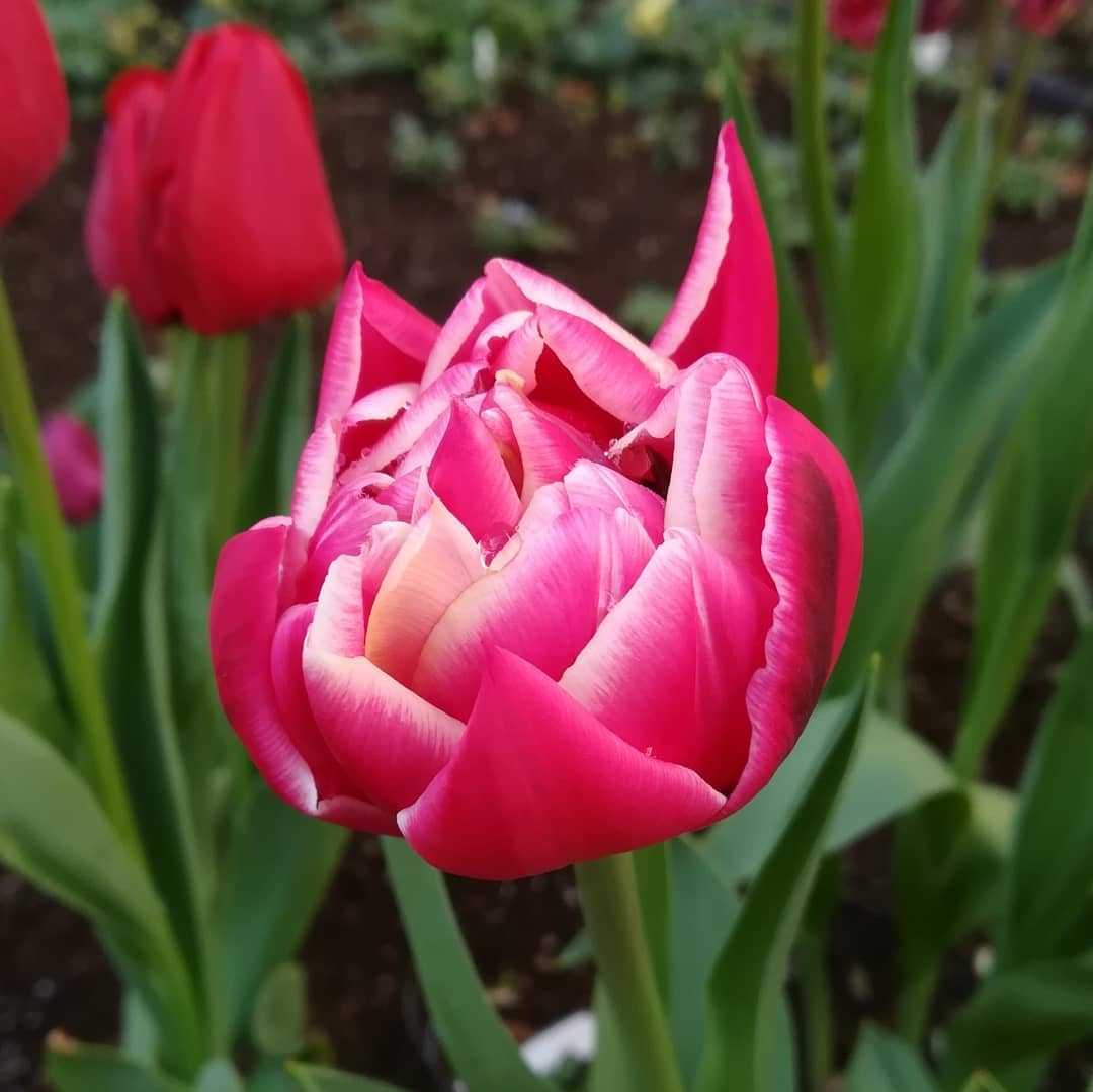 🌼 #チューリップの花中央アジア 原産ユリ科 チューリップ属の多年草。歴史も古く人気の高い球根植物で5000種を超える品種が登録されていて、更に増え続けております。球根の分球にて増やしますが、種子からも育てられるそうです、しかしその場合はお花を咲かせるまでに5年以上掛かるそうでして、分球の方が断然お手軽ですね。和名は鬱金香(ウコンコウ)あまり聞かない名前ですが、お花の香りが鬱金〈ターメリック〉に似ている事に由来するそうです。ピンと来ませんが、埃臭いと云う事だそうですよ。#チューリップ別名#鬱金香 #ウコンコウ #ウッコンコウ学名#tulipa英名#tulip花壇に植えられておりました。赤に黄色い縁取りのチューリップです。花期は、03月〜05月 頃早春から梅雨時まで咲くお花です。基本的に春咲きのお花でありますが開花期を調整した園芸品種も多く秋過ぎ頃には観られる様になりました。