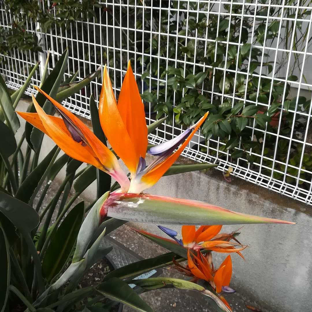 🌼 #極楽鳥花読みは、ゴクラクチョウカです。南アフリカ 原産ストレリチア科 ゴクラクチョウカ属の非耐寒性多年草。極楽鳥に似ている、という事で「極楽鳥花」まんまの意味ですね。「ストレリチア」の名称でも流通しています。南アフリカ地域に5種程分布し、鳥の頭の様なお花として以外でも、葉が綺麗なので観葉植物としても愛好されています。オレンジ色のトサカの部分がお花で、緑の嘴の部分は萼となっています。お花の部分は、オレンジ色の他白の物もあるそうです。#極楽鳥花 #ゴクラクチョウカ別名#ストレリチア#ストレリチアレギナエ#バードオブパラダイス学名#strelitzia_reginae英名#strelitziaこのお花もけっこう寒くなっても咲いておりますね。オレンジ色のお花の部分が二房咲いている極楽鳥花です。このお花もそれ也にバリエーションがあるのですね。花期は、04月〜10月 頃春から夏に咲くお花です。