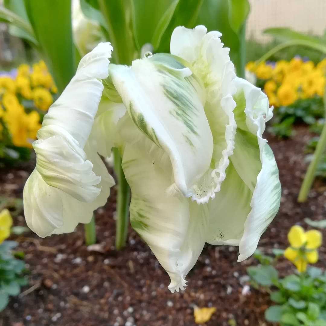 🌼 #チューリップの花中央アジア 原産ユリ科 チューリップ属の多年草。歴史も古く人気の高い球根植物で5000種を超える品種が登録されていて、更に増え続けております。球根の分球にて増やしますが、種子からも育てられるそうです、しかしその場合はお花を咲かせるまでに5年以上掛かるそうでして、分球の方が断然お手軽ですね。和名は鬱金香(ウコンコウ)あまり聞かない名前ですが、お花の香りが鬱金〈ターメリック〉に似ている事に由来するそうです。ピンと来ませんが、埃臭いと云う事だそうですよ。#チューリップ別名#鬱金香 #ウコンコウ #ウッコンコウ学名#tulipa英名#tulipかかりつけの病院の前庭の花壇に植わっておりました。白に少し黄緑色の掛かったパーロット咲きのチューリップです。花頭部が大きく重いので茎で支えられず、傾げてしまってましたね。花期は、03月〜05月 頃早春から梅雨時まで咲くお花です。基本的に春咲きのお花でありますが開花期を調整した園芸品種も多く秋過ぎ頃には観られる様になりました。