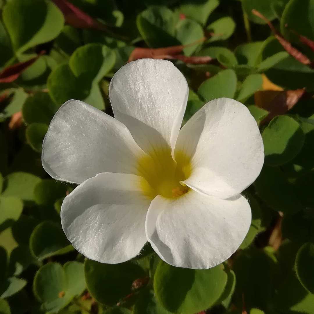 🌼 #芙蓉片喰の花読みは、フヨウカタバミです。南アフリカ 原産 カタバミ科 カタバミ属 の 多年草。南アフリカのケープ地方にて自生しており、日本へは明治時代中期に観賞用に渡来しました。暖地では越冬が可能で、太平洋側の九州、四国、地域では帰化しているそうです。フヨウカタバミの三つ葉はハナカタバミと同じ葉先の円い三つ葉♧でして、ハナカタバミと混同します。判別は花頭を見れば解りますお花の中央部が黄色いのがフヨウカタバミです。花片喰の方は黄緑色です。#芙蓉片喰 #フヨウカタバミ別字#芙蓉酢漿草別名#葵片喰 #アオイカタバミ学名#oxalis_purpurea英名#cape_oxalis白色の芙蓉片喰が咲いておりました。コレも一応は春のお花でありますね。花期は、04月〜07月 頃春から夏までに咲くお花ですが、暖地では、11月〜03月と秋から春先まで花咲く事があるそうです。↓ 楽天ショップ販売店のピックアップです↓草花の苗/オキザリス:バリアビリス ホワイト3号ポット2株セット冬咲き オキザリス バリアビリス ホワイト 苗 9センチポット