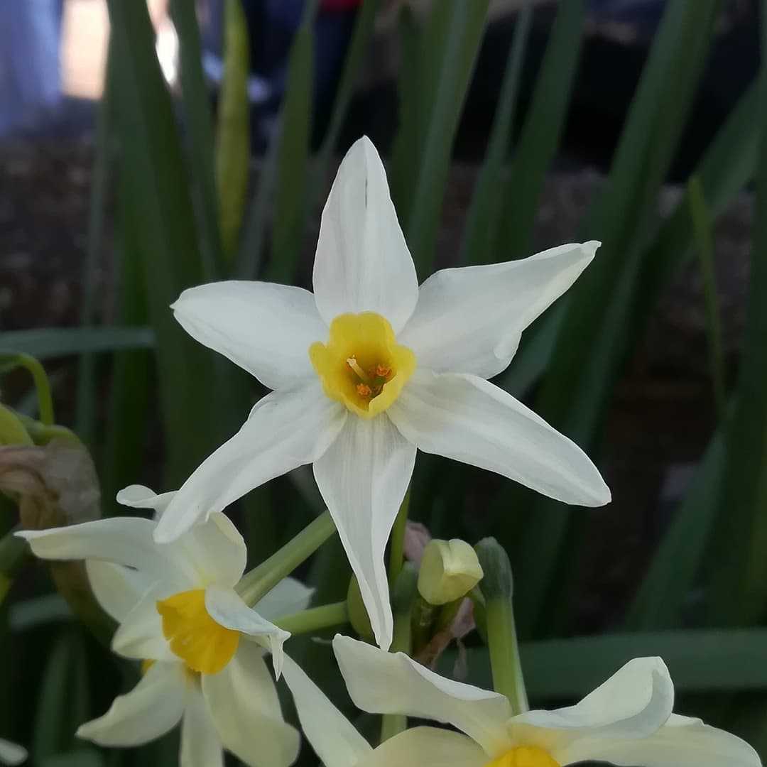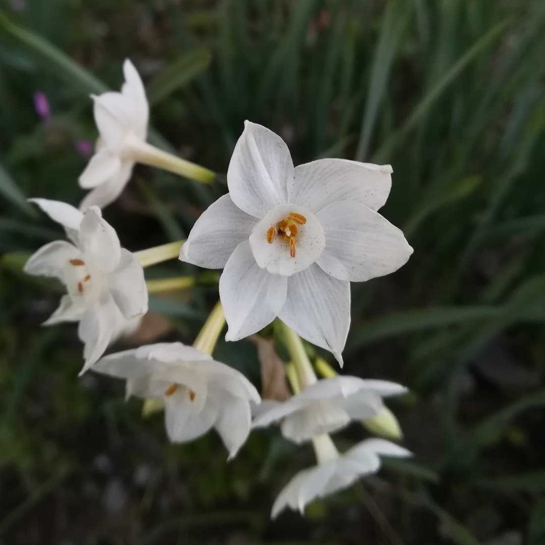 🌼 #白花水仙の花読みは、シロバナスイセンです。中近東〜地中海沿岸部 原産ヒガンバナ科 スイセン属の多年草。房咲き水仙の一種で、副花冠まで白い品種が、白花水仙となります。日本水仙に比べると一回り程小振りで、全体的に細く華奢な感じな水仙になってます。同じ株の物でも、咲く時期や気温の違いにより、白の色合いや、お花の大きさにバリエーションがあります。平安時代に渡来し、現在は帰化しております。日本水仙の原種との事。ー ー ー⚠有毒植物です。全草に亘りリコリンを始めとする有毒成分が多数含まれる為、絶対に口に入れない様にしましょう。有毒植物ではありますが、鱗茎部を薬として、腫れ物の鎮静剤にする場合もあるそうです。#白花水仙 #シロバナスイセン別名#ペーパーホワイト#ナルキッソスパピラケウス#房咲き水仙 #フサザキスイセン学名#narcissus_papyraceus_ker_gawl英名#paperwhite_narcissus水仙の続き、白花水仙も咲いておりました。花期は、12月〜01月 頃。冬に咲くお花ですね
