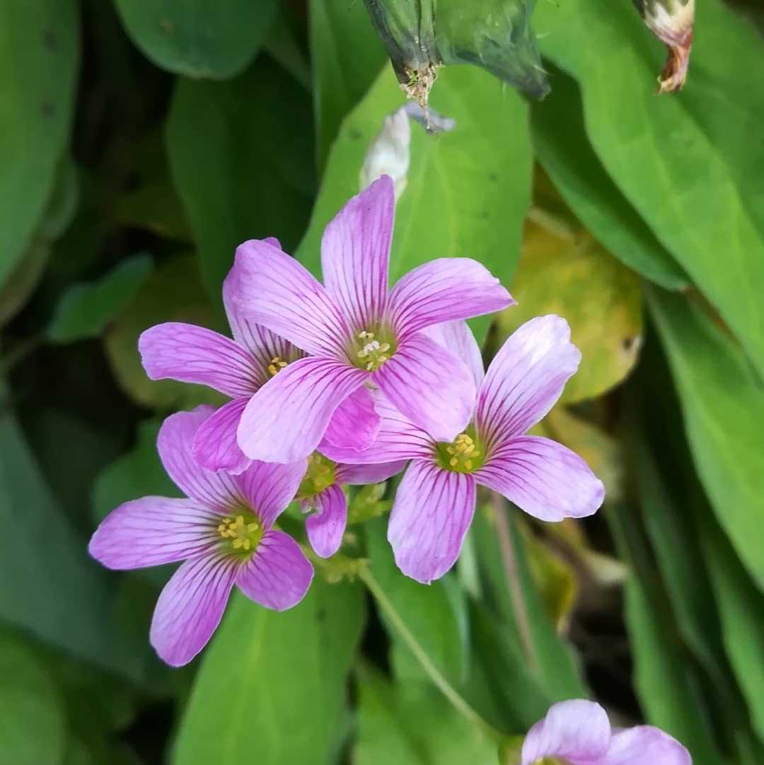 🌼 #紫片喰の花読みは、ムラサキカタバミ。南米 原産カタバミ科 カタバミ属多年草。江戸時代末期に観賞用に導入され強靭な繁殖力により土着し野生化現在は帰化植物となっています。開花はしますが種は付けず、地中の鱗茎から出る木子により繁殖します。一端着床すると、鱗茎を根絶するのは困難であり、駆除は容易で無いそうです。イモカタバミと似ていますが花の中心が黄緑色だと紫片喰。中心が紫色なのがイモカタバミです。二つ並べたら、中心部が紫色のイモカタバミの方が紫片喰に見えますが反対ですね。どう見てもピンクのお花ですが「紫」なのですね。江戸時代は、紫の認識範囲が今より広めで、今で云うマゼンタ辺りまでの濃いめピンクは、紫の認識だったのかも知れないですね。#紫片喰 #ムラサキカタバミ別字#紫酢漿草別名#桔梗片喰 #キキョウカタバミ学名#oxalis_corymbosa 英名#violet_wood_sorrel紫片喰も咲いておりました。そろそろ冬も本番と云うこの時期ですが、春を感じる要素でもあったのですかね?花期は、04月〜06月くらい春から初夏のお花です。