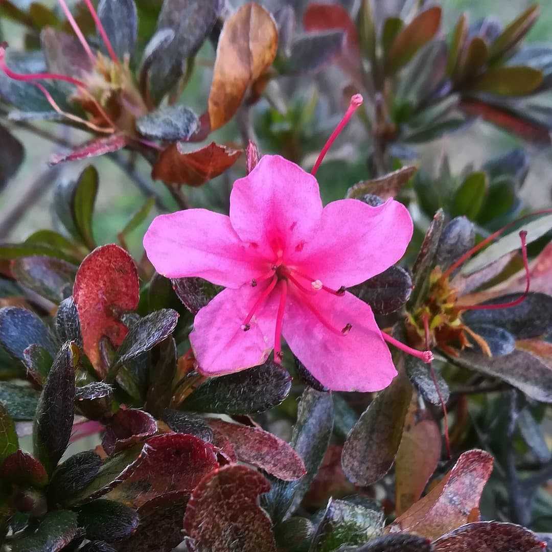 🌼 #皐月の花読みは、サツキです。日本原産ツツジ科 ツツジ属の常縁低木。ツツジの一種です。旧暦の皐月(5月頃)に開花する為皐月と名付けられています。ツツジに比較し葉は厚く小さい、ツツジは水に弱いのに比べ、渓流植物の特徴を持つ皐月は水に強い。梅雨頃に元気に咲きます。#皐月 #杜鵑花 #サツキ別名#皐月躑躅 #サツキツツジ#映山紅 #エイサンコウ学名#rhododendron_indicum英名#satsuki_azaleaお花は小さめではありますが皐月がまだ咲いておりました。紅葉しながら咲いてますね。花期は05月〜06月くらい梅雨時に咲くお花です。
