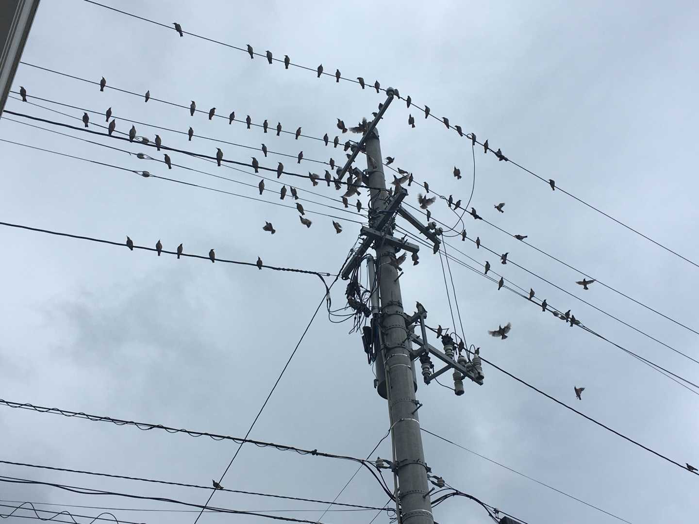 ムクドリさん達、木の実をついばんできて我が家の前の電柱に止まりぴーちくぱーちくお喋りしながらの落とし物がっ!
