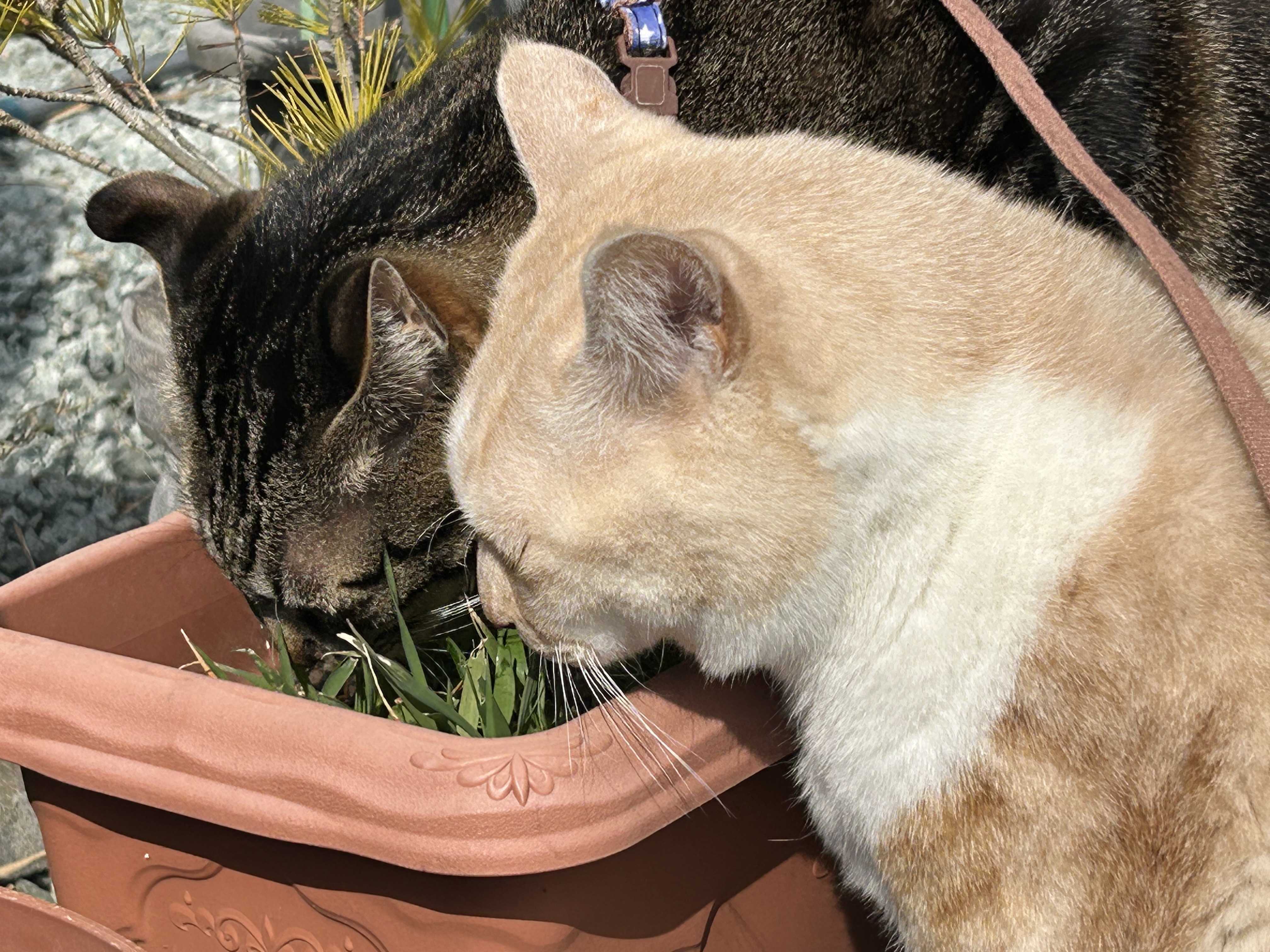 プランターは最近ようやく伸びはじめ、地植えになってる菜園のサラダバーは猫草とは思えないほど青々と茂っています(笑)