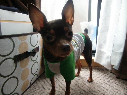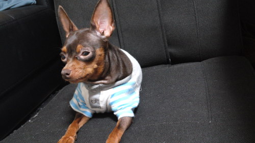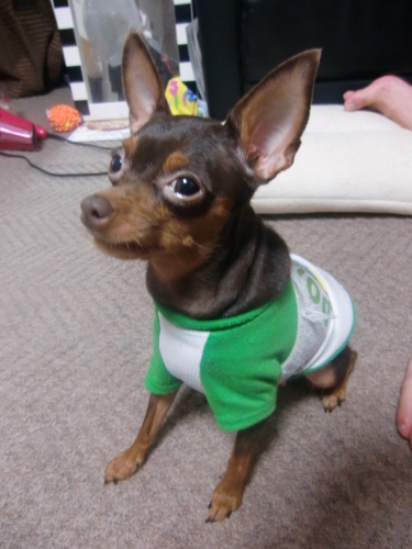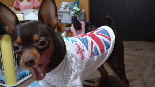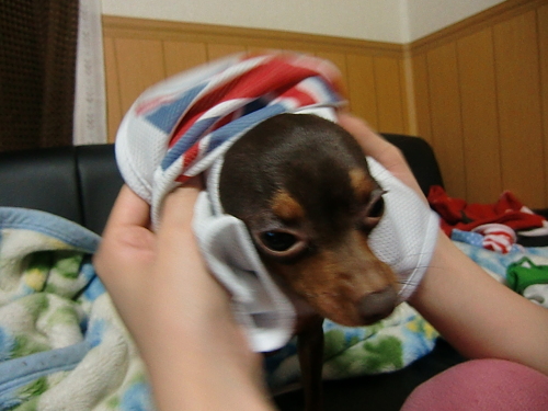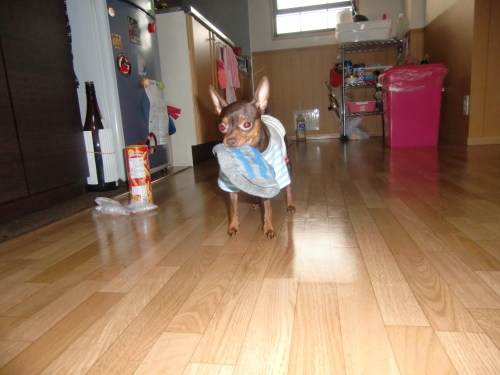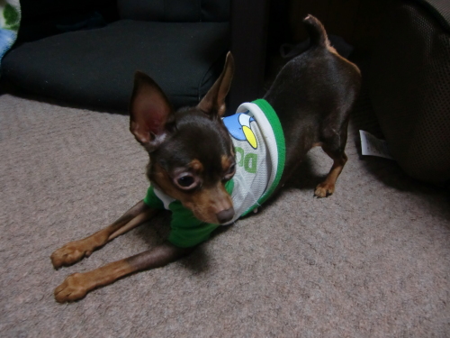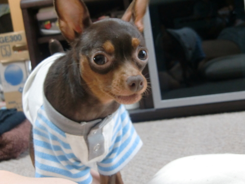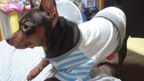 日曜日に買った新しい服洗濯してから着せてみましたはいっと服を出すと自分で着てくれます 足は無理だけど頭は自分で通してくれます1枚目のお着替え完了2枚目はなんか袖の縫いつけ方がおかしかった安いからしかたないか最近あまり掻かなくなったので今回の服は長持ちしそうですそして何をするかと思えば着ていた服を持ち出し自分のお家に運ぼうとするブブなのでしたくぅ