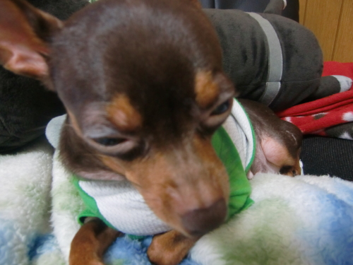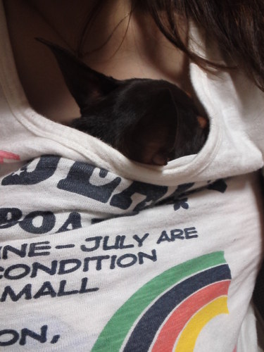 こんにちは(^▽^)/今日は朝からザーザー降りくぅはお休みなのでブブちゃんとのんびり過ごしています朝早くからカリカリしてくぅを起こしたブブちゃん昼はやっぱり眠たいらしい30分くらい服の中に入ったまま寝てます冬はもちろん夏もくぅの服の中に入ってきますくぅが移動するのに立ってもそのままカンガルーがお母さんのポッケに入っているいかのよう(笑)たまにひょっこり顔をだしますがまたすぐ潜ります冬は暖かくていいんだけどこれからの季節はちょっと暑い全然起きないので今回は写真1枚ですではまたいい写真が撮れたら更新しますくぅ