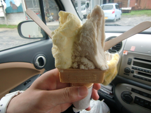 今日はくぅの実家に帰る日で帰る前に実家から15分くらいの安富牧場のジェラートを食べに行きましたアップルマンゴーとキャラメルアーモンドを2人で食べましためちゃうま可哀想だったので最後にコーンを少しブブちゃんにそして食べ終わって牧場にいるウマを見に 体が引き締まってかっこよかった~動いたら付いてきてとっても人になついていていました ブブもウマと記念撮影しようとしたけどうまく撮れなかったのでこれで我慢 ブブちゃんがウマになりました前向かなかったので無理やり前を向けて少しだけ雨が降ってたので散歩はできませんでしたがブブちゃんお外に出れて満足できたと思いますタイガ