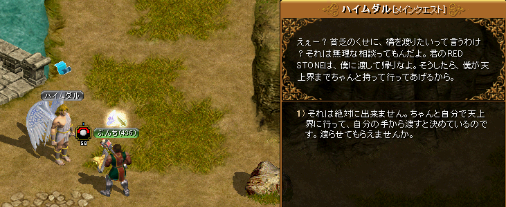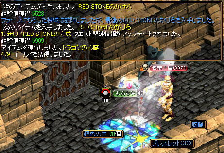 ・・・さて、無事秘密ダンジョンに潜入したぶんち。1Fでは3匹のボスを倒します。難しい漢字をつかったセリフ、言ってます。その割りに、いつもの攻撃ですが。2Fは、なんだか迷路になっていて、いくつかのポイントで敵を倒します。ぶんちのお友達もいたり・・・ ヽ(゚∀゚ )ノ3Fには、最後のボスがいます。いや、めっちゃ硬い・・・ような気がしました。そして、頼まれた福券手紙を渡します。・・・ぶんちの年齢がばれちゃいますね( ̄▽ ̄;)(この名前を見たら、言わずにはいられなかったんですw)さて、無事、秘密ダンジョンもクリアして、再び天上界へ。思ったよりも時間もかかり、結構メンドクサイです・・・でもまあ、しばらくは、マッタリと天上に通うことになるのかな。天上界といえば、称号をLvUPさせる報酬に興味がありましたが、迷って決められないというAB型クオリティ。ポーター、銀行、露店、MAP・・・どれあげよう( ̄へ ̄|||) ウーム・・・・・・・・・結局、HP+10%の報酬にしてしまいましたー^^;