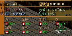 と、いうことで、とうとうLv440になりましたー!でも、まとまった時間があまりとれないので、秘密は行けなそう・・・いいんだ、スーパー鈍器をドロップするまで、オーガと遊ぶんだ。。。そして、Lv440記念オーガ狩りステ。沸きの多い場所だったり、かけら重視の場合はこちら。足を比率足にしているので、移動速度が足りず、少々沸き余らせ気味です^^;沸きのあまり多くない場所だったり、なんとなく気分によってはこちら。いまのところ、運の効果はあんまり出ていませんが、アイテムの出方はちょっぴり違うような気もします。撲滅速度を上げて数狩った方がいいのか、少々数が減っても運上げた方がいいのか、悩みながら、狩っておりますデス。