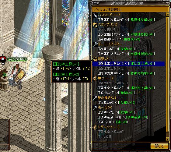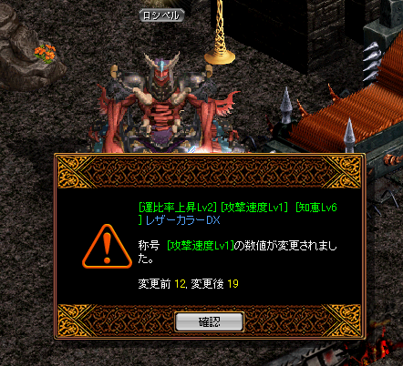 お久しぶりでございます、ぶんちです。なにかとバタバタしておりましたことと、狩場の混雑振り&使ってます攻撃にやられ、しばらくINしませんでしたが・・・3ヶ月ぶりにINしてみました。INして2日目、偶然ですが、ばったり会った先輩BISさんにも耳も頂きありがとうございましたー! (名前隠してませんが・・・いいですよね^^;)さてさて、久しぶりにINしてみようと思ったのは、やっぱり、メインクエ5実装! (遅い?)なんだかおもしろそうな報酬があるではないですかー。○ 青色の魔力増幅魔法書 ユニークアイテムを除いたアイテムの称号レベルを次の等級の称号に向上させる。 ただし、該当アイテムに付与できる最高レベルの称号までしか昇級しない。巷では、この魔法書で、比率Lv1→比率Lv2にした、比率1/2があふれているとかいないとか。これは、も・も・もしかして、ぶんちの趣味品が、エライことになるのでは・・・よしー、メインクエがんばるぜーと思ったら、3-9 アークデビル の手前で止まったままでした^^;(ソロで撃破しようと考えていたのを思い出しました・・・)まだ、メインクエ3とかやってる人、いるのかしら???