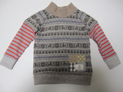 もう、12月も半分が終わりましたね。今年もあと少しで終わってしまう~年末ということで仕事のほうも忙しく、なかなかヌイヌイの時間を捻出できずにいますそんな中、やっと1つ完成しました~※型紙 milimili「キッズトレーナー」120※布地 animo(トナカイのジャガード茶)コートヤードさんで購入(mochamocaのスパンなしリブ 裾に使用)SMILE(袖口のスパンリブ おまけセット)cocome`re(アラン風縄編み モカ)※タグ RickRack(おまけタグ)※フロッキープリント(アンの木パターン)ありきたりは嫌なので、いろいろいじってみました。手作り感丸出しです襟ぐり・袖口・裾ともすべて違う布を使用しています。袖は重ね着風に。後見頃にはヨークを付けました。部分部分をつなぎ合わせているので、余り布を活用できました50センチ以下で中途半端に残っている布って、なかなか使えないのですが、この方法なら、いい具合に在庫布の活用になりそうですポケットもつぎはぎ~タグはあえて赤糸でステッチしました~後ヨークも切り替え~少し、ヨーク部分が大きすぎたかなちょっと変ヨーク部分が大きかったので、フロッキーをのせてみました~フロッキー、最初の部分が剥がれてしまいましたでも、もともと読めない文字だから、いいかっみんな気づかないはず!