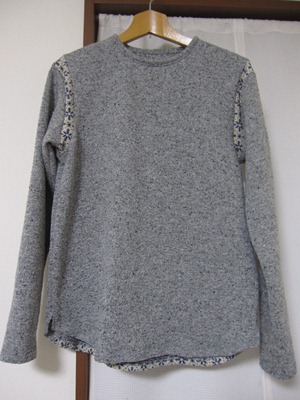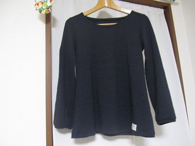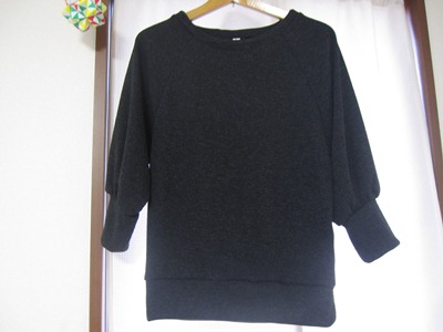 1枚で着てもサマになって、デザイン性があるものが欲しくて、作ってみました。※型紙 クルール「ラグランギャザースリープニット」9号※布地 クルール「ウォーム加工スムース」ミッドナイト杢アクリル100%の布だったと思います。程よい厚みで、少しのテンションがあります。ユニクロさんのヒートテックのフリースに感じが似ています。あったかです柔らかい布で、滑るのでミシンに巻き込んでしまったり、直線がずれたりしてしまいました。パターンは、(普通にしていれば)すっきりに見えますきれいなパターンです。しか~し、ラグランだから、動きやすいかと思っていたのですが・・・ドルマン風の形で、腕の動きが制限されます腕を上にあげると、袖がつっかえ、腹が見えます袖丈も、長袖ではなく7分袖で、動きに合わせて短くなっていくので5分袖くらいにずり上がってきます。真冬には不向きです(見えても良いアンダーを着れば冬でもOKですが)デザイン性があり、かわいいし腕を下した状態だとすっきり見えるパターンなので、今後は袖を長めにして春秋用のカットソーとして作りたいと思います。裾(後ろ側)にレースを挟んでみました