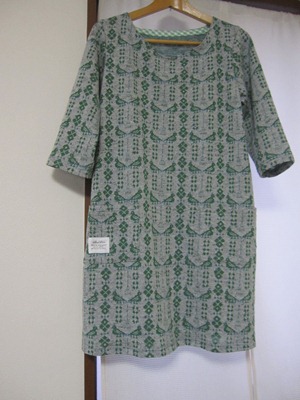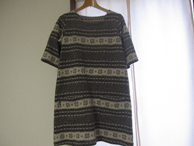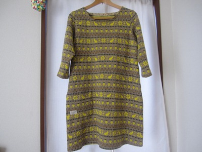 またまたお久しぶりになってしまいました~以前作ったニットワンピです。これも、お世話になっている方へのプレゼントに。家に余っていた以前はやった柄のジャガードで。※型紙 Wildberry 「ニットワンピ」※布地 animo 柄の1パーツが意外と大きくて、柄合わせをしたら、1mでは少し足りずに、袖が少し短めです(5分袖)ポケットも柄あわせしたので、タグをビス風にしてちょこっとポイントにいつものパターンにありふれた柄。。。。でも、なかなかの出来でした