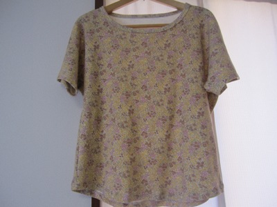 またまたドルマンTシャツです※型紙 polka drops ドルマンTシャツ(Mサイズアレンジ)※布地 coco me`re先日(といっても、結構前)に久々にcoco me`reさんに行きました~かわいい布たちに癒された~その時に一目ぼれしたベージュ?黄色?地の花柄の布。サンプルでチュニックも作られていて、とても素敵だったのでお買い上げ~早速作ってみると・・・確かにかわいいのです。かわいいのだけど・・・着る人を選ぶ色ですね普通に着ると「おばあちゃん」になりますとても若い人が着るといいのだけど、年配色が拭えませんね母へのプレゼントにしようかな~と思ってますパターンは着るととてもスッキリ細めに見えますでも、襟ぐりが少し広く、丈も長めだったので、襟ぐりから肩にかけてはSサイズでその他はM裾丈は4センチ短くしています。なかなかのジャストサイズアレンジしたら、布1mでできました~1mでできる服って、魅力的です~