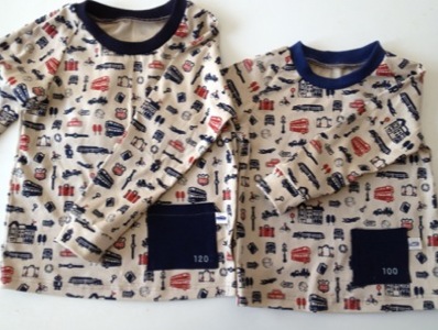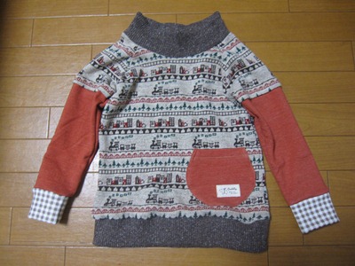 まだある~2013の作品の続き・・・甥っ子たちへのお年玉代わりに洋服のプレゼントです(甥っ子たちは、現金がうれしいだろうけど)※型紙 milimili「キッズトレーナー」120※布地 cocome`re (汽車のジャガード、スラブニットレンガ、リブニット)大好きなcocome`reさんのニットが集まったトレーナーですやっぱり布がいいからかわいいポケットは最近お気に入りの丸ポケットです甥っ子兄用こちらもほとんどcocome`reさんの布~
