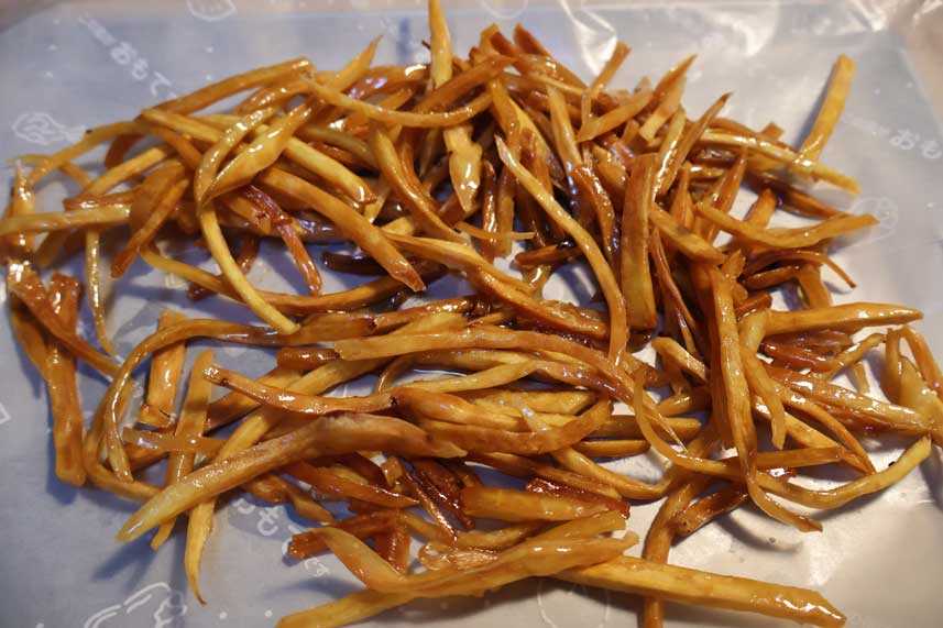 サツマイモを1本5ミリ以下ぐらいの細切りにする。レシピには乾かすと書いてあったがそのまま180度のサラダ油にドボン。きつね色にカリカリになるまで揚げる。トレイにあげておく。フライパンに水・・大さじ2~3に大さじ3~4の砂糖を溶かす。加熱して飴状になる手前で揚げた芋を投入してからめる。クッキングシートの上でさます。完成!飴が少しべたべたするが食感のカリカリはそのまま維持されるようだ。簡単なので是非!