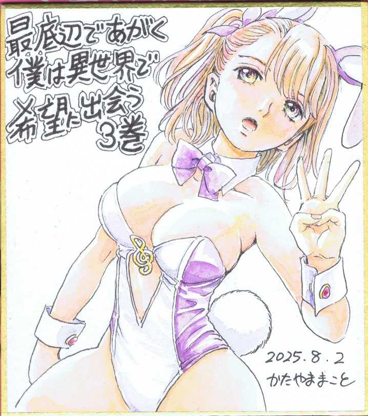 「最底辺であがく僕は、異世界で希望に出会う」3巻の イラストはがき企画の告知です。 コミックスを買ってツリーの応募方法にそって画像を Xにあげてアンケートに答えてくださった方の中から 抽選で18名様にどれか1枚プレゼントします。 #あがであ3巻企画以下が応募方法と期間です 「最底辺であがく僕は・・」3巻を お買い上げのうえ 「コミックスと好きなもの趣味なもの」と 一緒の画像とアンケート「かたやままことをはじめて認識した作品名」を書いてポスト!そのとき必ず ハッシュタグ #あがであ3巻企画 をつけてください応募期間は9月18日の3巻発売日から9月26日(金曜)23時まで!!!「電子コミックス」は不可とさせていただきます。イラストはがき企画はサイン本を買えなかった人のために始めた企画なので、申し訳ございません。イラストはがきの発送は国内限定です。「かたやままことをはじめて認識した作品名」は「片山誠」でも「かたやままこと」でもとにかく「作品名」だけ教えてください。「あがであ」で初めて知った方は「あがであ」でOK!尚、「イラストはがき」は原則ポストにむき身で届きますのでご注意ください。