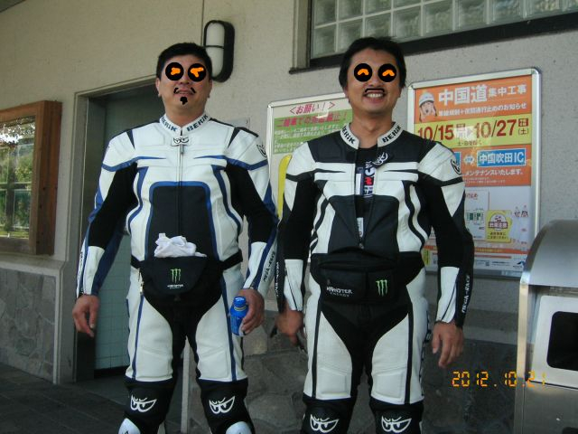 昨日は革ツナギを買うために箕面のボスコモトへ走った。朝六時半に駐車場に集合。連絡足らずで六時半出発か集合か書いてなかったので他二名は既に到着。取りあえず小便を済ませおにぎりを食べる。此処で集合する残りひとりブラックバード野郎の到着を待つ。念のため別の場所で集合するディトナ野郎に電話をする。携帯を鳴らしても応答無し・・・・仕方がないので自宅の固定電話にかけたよ。最も出る前に切ったから奥様が起こしてくれるだろう!朝早くから申し訳ないです奥様前日に縫製しなおしたgoooo!!!!ヤマハのジャケットとちょっとボロってきた合皮パンツに着替えると早速小便が出る。利尿作用があるから珈琲は今回飲んでないのだが・・・出来ったらいざ出発だ。七時半所定の京都縦貫道手前のコンビニ到着。慌てて小便を済ませる。此処もかなりの量だ(笑)だが、ディトナ野郎さんはまだ来ない(笑)が、程なくて到着したのいざ縦貫道へしかし、亀岡は最初に走りに行った時と同じく濃霧である。まだ朝だったから走れるが、夜だったら無理だったろう。視界がかなり悪く数百メートルしか見えないぞ(笑)前に追従して走る。下に降りてからも見通しは悪く大丈夫かと思われたが亀岡から離れると不思議と回復した。亀岡で縦貫道を降りて直ぐ左折372号線を通って477号線を下り妙見山へ行ったはず(笑)そこで休憩。到着と同時に小便に向かう。出してばかりだと血がどろどろになるので自動販売機でお茶を買う。120円入れてボタンを押す。取り出し口に商品が落ちる。チャリンチャリン???おつりが110円返ってきた。あれ?お金要れ間違えたかな?百円入れて見る。そうするとお茶のボタンにランプがついた!押してみると出てくる。おつりも90円出てくる。なんや10円なんや(笑)いやいやちゃうやろ!そうなんや設定間違ってるンや!しかし正直者のオレは近くに居た店のオバサンに設定が違っていることとお茶一つ(試しに買ったやつ)と10円玉9枚を渡した。正規の値段で買ったお茶は旨い!(笑)出発前に小便を済ませる此処まで全てかなりの量の小便が各回出ていた。その後道を選考しながら走るブラックバード野郎さんとZX-6RR野郎さんが止まる度に小便をこなす(笑)目的地のボスコモトに到着してまずすることはお姉ちゃんの品定めじゃなく小便。その後に試着。可愛いお姉ちゃんだったので営業トークに騙され残りの一着ということで革ツナギを買ってしまいました。着ていた服は持って帰れないのでZX-6R野郎さんの所に宅急便で送って貰うことで落ち着いた。さてここから出発する際にツナギを来ながらの小便を初体験。やはりやりにくいな(笑)チ○ポを取り出すのに一苦労だ。うん○だったら脱がないと無理だな(笑)ここからまた縦貫道に向った。縦貫道の南端PAでトイレ休憩(笑)ついて直ぐに小便ここからの三枚はディトナ野郎さん提供の画像だ。向かって左が私で右側がZX-6R野郎さんだ。なんだか怪しい中国人みたいだぜ!(笑)見事なバックシャン画像(笑)出る前に小便(笑)ほんと何回出るねん!って感じだ。もちろん園部から日吉ダムを抜けて道の駅みやまふれあい広場(笑)通称赤橋、殺伐広場に行く。此処でもまずは小便思い出したけどオレはお腹も緩いんだよなぁ(笑)どうしようかな・・・次は高雄高山寺前で休憩することは小便だ走ってるのか小便してるのか分からなくなってきたよ。ガソリンが無くなってきたので福王子で入れる。227km走って16.8L入った。13.5km/lだった。悪いけどそこまででは無かったな。無事走り終え駐車場に到着。ここでもまずは小便一分以上は出続けてたよ~皆さんお疲れ様でした。左手が痛くて大変だった方も居られますが本日は大丈夫でしょうか?私は両肩が五十肩です(笑)またよろしくお願い致します。左から二番目がオレのバイクXJR1200だ。よく見たら俺一人だけカテゴリ違ってるなぁ(笑)
