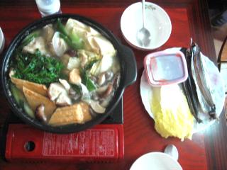 具材は、しいたけ、まいたけ、豆腐、ねぎ、鶏肉、春菊、