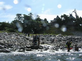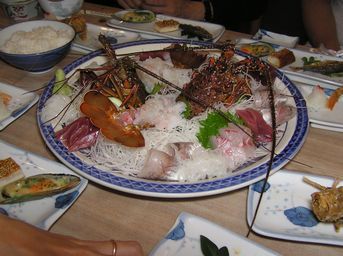 朝からハプニングの一日。ダイビング歴は長いけどチョー久しぶりっていうダイバー夫婦と一緒に西伊豆に行く予定です。連休だし遠いからできるだけ早くに家に来てねといったものの、朝が弱い夫婦。でもがんばって8時半くらいに来たんです。さぁ出発というところで私が「Cカード持ってきたよねぇ?」と確認したら「あっ、えっ、忘れたぁ!」どんなショップだって初めての客のCカード(ダイバー認定証)の確認はするでしょう。ダイビングからいかに遠ざかっていたことか、しょうがないから取りに帰るってことになり再び家からの往復。せっかくの早起きは報われず戻ってきて再出発は11時前になってました。すでにとても混んでいる道を走り、西伊豆大瀬に着いたのは3時。のんびりペースの私たちにぴったりの時間、1本潜って気持ちはすでに夕食へ。今日の宿泊は”貝殻亭”でイセエビ祭り。刺身のために伊豆まで来たと思えば楽しいですから。貝殻亭のお刺身はいつもながらおいしく、このイセエビのお皿はすぐにからになりました。
