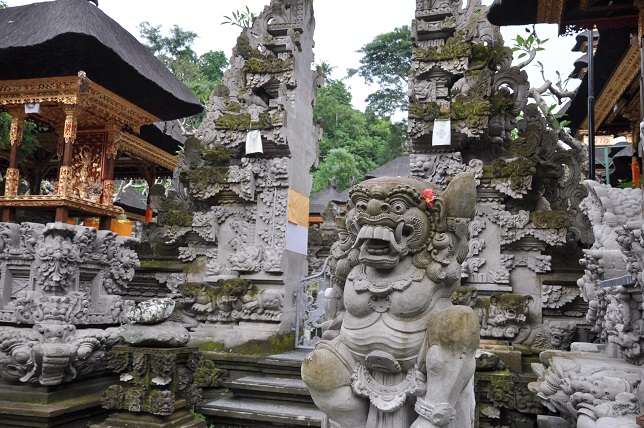 ダラム・ウブド寺院では翌日からの祭事の準備がされてましたたくさんあちこちにお寺がありますが、彫像は見事車で走ると石屋さんが多くて、店先にたくさんの石像が並んでいるのが見られたこの日の夜はバリ舞踊のチケットを買っていたので夕食を済ませてからサレン・アグン宮殿へ 食事してたら前の道路をバロンが歩いて行った独特の踊りと華やかな衣装が見事 ガムランの響きと太鼓のリズムで展開していくさまも印象的でしたここで見るからいいんだよね ------------------そして翌日、タクシーで一日観光することにしたタクシーの勧誘はすごいし、どこへ行っても困ることない一日貸切にしたほうが安いかもと思って、時間通りにちゃんと来てくれた道が少ないので混んでいる町を抜けて、北に向かって行くグヌン・カウィGunung Kawiという石窟遺跡、長い階段を下りていくとあったヤシの実で作ったかご、ランプなどの工芸品をつくりながらお店を開いてるところが多かったそこから近くのティルタ・ウンプル寺院Pura Tirta Empul聖なる水が湧き出でている遺跡の寺院、魔よけの泉で沐浴している人が数人いましたきれいな水がコンコンと湧いていたけど、沐浴場にはお魚泳いでた車はまた北へ向かって、コーヒー農園に連れて行かれたカカオの木とコーヒーの木とジャコウネズミがいたりしていろんな説明の後、コーヒーやお茶の飲み比べをさせられて買ってくれと、、、こうやってたまに来る観光客の買い物などで収入を得ている人も田舎にはいるのですそのあとはキンタマーニ高原まで行きました、標高も高くて少し寒かったバトゥール山を眺めながらランチしてたら少し曇ってきたつづく