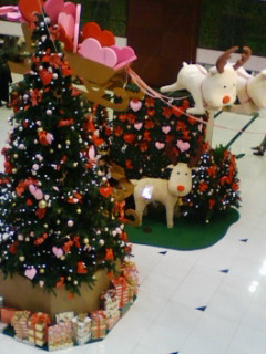 トナカイが登場!大きなツリーの横で、上でソリを引っ張ってます