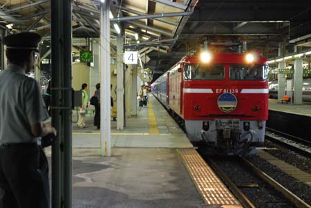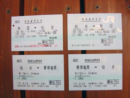 実は、先週2日、あけぼの号で青森に行ったその次の日!また寝台特急あけぼの号で帝都東京へと行って参りました。※だからこの日記は9月3日からのモノになります。どうも寝台列車で上野へ行く行動がしたかっただけの様子。その日、仕事していてマルスで本日のあけぼの号を空席紹介してみたら、ゴロンとシートが1個だけ!それも下段が空いていたので思い立った訳だ!丁度明日は休みだし、ぶらっと行ぐがなって思った訳だ。■2日連続で3度もあけぼのに乗車するなんて珍しかろう。。■読書灯の灯りも寝台特有の設備である。最近の日本の列車には 必要とされる機会が少なくなってきた。こうして列車に揺られながら夜は更けてゆく・・・9月4日 AM6:00朝日がカーテンの隙間から差し込んで目が覚める。放送ではあと2分ほどで大宮だそうだ。■列車の中での夜明け、この先もう経験できなくなるかもしれない。6:31 列車は時刻通りに大宮駅に到着■大宮駅、ここから終点上野までラストスパートをかけるそっからおよそ30分、あけぼの号は定時に終点上野駅へと到着した。■上野駅中央改札口腹を空かせているため、とりあえず上野駅前のいつもの朝飯屋へ直行!■これで390円くらい。早朝から深夜までやっている。 最近HPつくったみたい。ここ→■さて、今月またもや東京へと来てしまった。山手線で原宿駅を目指す。■明治神宮じつは明治神宮は初めてきました。御名御璽。東京の朝を緑の中でのほほーんしながら新宿へ■中央線特快、山の手、営団地下鉄と乗り継いで恒例の場所へ…■説明不要■仲見世通りなーんでいつもここなんでしょうな。人形焼食ってぶらぶら~■かっぱ橋で通常では手に入らない物資を買うべく 浅草から田原町の方へんで、■秋葉原ラジオセンター■総武線ガーター下にあるマニアックゾーンだが、コンデンサーやら 半導体やら細かい部品までとりあえずこの類は何でも手に入る。せっかく秋葉原に来たので携帯を買い換えますた!そうしているうちに東京も夜だ。■アメ横で帰りのつまみを買ってく。 そういえば夜のアメ横に来るのは初めてだ。明日はまた仕事、帰りもあけぼのだと完璧なのですが流石に秋田早朝着のあけぼのでそこから仕事へ行くのは宜しくない。列車が遅延なんかしたらこっちも遅刻になり兼ねない。たとえ同業とはいえ許されない。なので新幹線こまちで一気に帰ります。それもなんと人生初のグリーン車 疲れたので爆睡すべく、乗変した訳です。一瞬で秋田に着きました。今回もまた気まぐれで放浪、どうも癖になってきています。あんまし宜しくないです。休日は体も休めましょう。