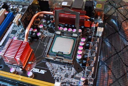 さて、パソコンの部品が到着致しました。今日から新たなPCを組むべく、家(寮)に引きこもります(`・ω・´)シャキーンマザーボードにCPUを取り付けます。■今回使ったマザボは P5K-E/WiFi-AP LGA775 CPUはCore2Quad Q6600■Core2Quad6600と巨大なCPUファン Thermaltake V1 CL-P0401 最近PC雑誌等で冷却性能評価の高いこのクーラー、 噂には聞いていたがデカイ・・・ ケースやマザボのチップセットとの干渉が心配に・・・■マザボにThermaltake V1 CL-P0401 を取り付けました。 幸いチップセットとの干渉はギリギリセーフ!!! 銅の光沢がカッコいいです!(゚Д゚)■今回メモリはDDR2 6400 1GB を4枚差し■メモリースロットは満杯に!これにてRAMは4095MB(4G)に!マザボへの取り付けが終わり、お次はそのマザボをPCケースへと取り付けます。■少しPCっぽくなってきた。今回使ったケースは オウルテック OWL-603AT(B)/N ブラック 想像以上に凄く良いケースです!お勧め!この後HDD(750G)DVD-R、3.5インチ、電源(750W)VGA(VGAはなんとEN8800GTS!!)を取り付けまして、いよいよ完成に!配線がごちゃごちゃしています。■V1とHDDクーラーが青く光っておりますw■電気消すとこんな感じ。■いかにも冷やせそうって勢い・・■正面の5インチベイにはファンコントローラーと 各機器の温度を監視できるモニターを装着。 これにてリアルタイムにPCのバイタルが分かります。PC自体は完成ですよ(゚∀゚)