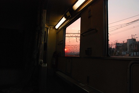 寝台列車に揺られながら随分飲んだ。どんなに洒落た居酒屋よりもずっと楽しく飲める気がする。そうしている内に寝てしまっていた。何となく目を覚ますと日付は既に変わっていた。停車かと思うと大阪駅であった。2分遅れのAM1;10着寝よ…。■漆黒の中をただひたすらに走る。(最後尾車両より)それでも目が覚めてしまう。5時頃であっただろうか、未だ消灯時間の薄暗い通路で車窓を眺めていた。カーブを大きく回り、尾道大橋を通過。久々の風景だ。広島県に入った様だ。しかしこの時間に広島県?・・・こりゃ遅れている。それもその筈、辺りは夜でもはっきり分かる程の深い霧。瀬戸内特有の冬の濃霧である。広島駅手前のセノハチは難無く越えたが運転停車を繰り返し、広島駅には約40分遅れの5:58着であった。そうしている内にだんだんと東の空が明るくなってきた。朝靄の中に宮島が見えてきた。■瀬戸内海の夜明けどうやら今日は天気が良さそうだ。霧が晴れ、朝焼けの中に瀬戸内海の島々が見えてくるとテンションは朝からヤバくなる。■御来光!徳山・防府・新山口・宇部、山陽道は間もなく終点である。■新山口駅からの朝飯 穴子飯 因みに友人は何故か車内販売でもみじ饅頭を買っていたwそして下関には50分遅れで到着した。【続く】