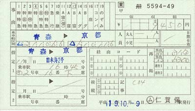 最近管理人は風邪を引いてしまいました。風邪といっても自覚症状は微熱のみ。一番厄介である。ベンザ飲んでいるがこれ以上続くようなら抗生剤医者からもらってこねば。というわけで急に寒くなった秋深まる秋田、そろそろ白神でも冠雪してもいい頃である。皆様も体調にはお気をつけ下さい。そんな今日この頃ではあるが、同僚が京都へ行きたいと申してきた。11月の勤務を見ると丁度3連休が半ばにあるではないか!せっかくの連休だから久々に西日本まで足を伸ばすのもよかろう。そんで京都まで行くのなら我が第二の故郷、広島県尾道市まで行くのもよかろう、早速切符を手配しなければ。向った先は仁賀保駅、仁賀保駅にはマルス端末が設置されていない委託駅になるため、それを知った上で向った。マルス端末の設置されていない駅では指定席券を発券する際料金補助券という手書きの切符を売ってくれる。■せっかくなんで始発の青森から日本海号に乗り 西国の地へ誘う事に。マルス指令という指定席を扱う場所へ連絡し、指定を確保の上、手書きの切符を売ってもらう。昔ながらの切符が完成します。乗車券も出札補充券という形で作ってもらえるのですがそこまでやってもらうには迷惑であろう・・羽後本荘駅でマルス発券してもらいました。■社員の乗車証が使えるのはJR東日本最果の地、 直江津から買えばいい。とりあえず行きの切符の確保はすみました。来月までに風邪をなおさねば。。