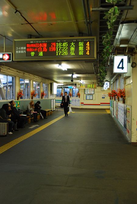 ダイヤ改正の本日、私は丁度仕事で出ておりました。例の鹿角花輪気動車も701系大館行の快速に置き換わり日本海2、3号も消え、LED表示には「日本海」とだけ出るようになりました。連日ファンで賑わっていた駅も静まりかえりかわってSuicaの導入によるイベントで盛り上がりを見せておりました。 私は、まー鉄道は好きっちゃ好きです。否定はしません。しかし臨時が走るからといってこぞって見に行く廃止になるからラストランを乗りに行く珍しい列車が回送で通るからカメラを並べるそいういった事には全く興味がないのです。ですから鉄道のイベントとかには見向きもしないのである。私が好きである鉄道とはごくごく自然な形のものであり普段何気なく走っている列車、今回のダイヤ改正で最後の貴重な運転といって持て囃される列車ではなく国民の生活の中に溶け込んでいる当たり前の存在というその存在が好きなわけで、ですから今回の様な廃止になる→もう見られないから撮影に行くそういった概念をもたれてしまっては結果としてそれは自然な形から相反する存在になってしまう。こうなるともう既にこの時点で私の中では廃止されているも同然一時の癒しでしかない、これは単なる「愚にもつかぬ祭」張りぼてで作られたごまかしでしかない様に思える。廃止が決定したからといって写真を撮りに行く私なら廃止になる前の自然で当たり前の列車を撮る方がよっぽど美しく撮れるのではないか、よっぽど価値のある写真が残るのではないかと思う。秋田支社が過去に行った、五能線の車両を旧国鉄時代の朱5号というカラーにリメイクした事業があったがあれこそが自然な形を生かし、ごく当たり前な生活の中にある鉄道をより引き立てた、成功例の1つといっても良いと思う。それにより五能線は今、国鉄色の車両が当たり前の生活の中に存在している事として密かに且つ暗黙の定着として認められている。団塊の世代、世代交代の時代の今高度経済成長により大量生産されたものが今正に一斉に朽ち果ててきている。人もそうだが建築物から何から何まで世代交代の時期といえるであろう。そんな中、過去の遺産を次の世代へ繋ぐというのは難しい事ではあると思うが、ちょっと発想を変えればより効率的に、斬新且つ低コストで実現できるのではないかと思う。これからの鉄道社会にはその点を期待しつつ、私も今のグダグダの人生をなんとかしなければ未来がないなーと思う今日この頃である。