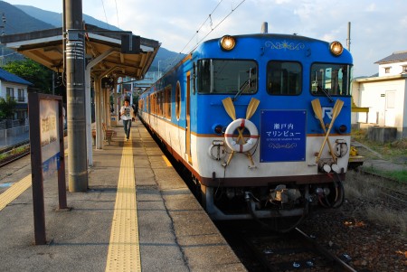 2008/07/18翌朝、トンネルの音で目が覚める。と同時に車窓が明るくなり敦賀の町並みが見えてきた。丁度いま北陸トンネルを越えたらしい。爆睡でありました。この青森発、日本海号大阪行きは敦賀にて毎朝機関車の交換が行われます(通称:釜換え)機関車はここから大阪まで走り、その日の晩に大阪から青森へ走り、またその日の晩に大阪へ向かい、途中のここ敦賀で業務を引き渡す、という交代制なのです。■EF81の釜換え ここは敦賀駅んで腹も減ったので駅弁を車販より購入3人いるので3つとも種類の違うのを購入■それぞれ右から 北陸名物 甘えび寿し 柿の葉寿し 焼きさば寿し列車は湖西線へと入り、進行方向向かって左手側には雄大な琵琶湖が姿を現す。■琵琶湖 乗務している車掌にもよるのですが ここを通過時に琵琶湖に関するガイドアナウンスが入る時があります。京都を過ぎるとおよそ30分ほどで新大阪へと到着する。■次は終点の大阪 ラストスパートさて、我々はここから広島まで新幹線を利用するのだが今回は4人用個室を利用する事に。ひかりレールスターという新幹線をご存じだろうか?新幹線とは忙しいビジネスマンの交通手段のイメージが強く、旅行に使うのも確かに早くて便利なのだがどうも堅苦しい。そんな顧客ニーズに答えて開発されたのがこのひかりレールスターまずは百聞は一見にしかず→■■新幹線と飛行機が対立する中で、陸路の長所を生かし、ゆとりある空間を築いちゃったのです。で、これがソレ■これでもスピードはのぞみと同じくらいだよそして話は戻るがこいつには4人用個室がついている。4人揃わなくても今回の様に輩が3人いれば3人から利用可能なんです。(フルムーンに限っては夫婦2人でも利用可能)それがコレなかなかモダンでいいんでないですか?コンセントや読書灯も完備され、なかなかいいんでないですか?■壁にあるコレを押すと車内販売の方が来てくれます。■レールスターの個室はこういう120mm券で発券されます。そうして一気に山陽路を駆け抜け、広島県福山駅へと到着。今回は福山駅がスタートです。■んでまぁ、こちら方面に行くのはお解りでしょう。。ここから山陽本線三原行きに乗り、尾道へ向かう訳です。■帰省の奇声をあげる今回は前回春に訪れた時の逆コースで行く事にした。天気予報では雨の筈だったのですがコレが意外と良い天気!むしろ凄く暑い・・・時間はお昼なので尾道ラーメンを食うべく商店街へと向かいます。■商店街からの小路を見上げる。今回案内したお店は朱華園というお店。広島県でも有数の 行列の出来るラーメン屋 なのだ。気になる人は朱華園で検索してみて下さい。尾道ラーメン=朱華園という位置付けかもしれません。■朱華園の暖簾をくぐる先輩w 我々3人は強運の持ち主で、先ほどから威力を発揮中。まずは天気が最強の晴れに。そしてこの朱華園も我々が難なく入って丁度満席、外には恒例の行列が。■朱華園のラーメンシンプルな鶏ガラ出汁だけど癖になる味。春に紹介した「つたふじ」は麺の断面が●だけどここは楕円気味。喉越しはこっちのが好きかも試練。腹も満たされた我々は尾道の街中をぶらぶら彷徨う事にした。■尾道最古の神社といわれる艮神社 樹齢900年を超える大楠は圧巻坂道を登って登って登ると暑いんですけどでも町並みが尾道らしくて足は止まらない。登って登ってのぼり終えればこんな景色と潮の香が。天気も良くしまなみ海道が四国の方まで見えました。ここは千光寺公園、千光寺 街を一望出来る場所です。千光寺山からはロープウェイで一気に下って、先ほどの艮神社の所まで戻れます。が結局また登る。尾道は相変わらず坂が多い。それが最大の魅力なんですよ。■映画「転校生」で有名な御袖天満宮 ここの階段で転げ落ちて魂が入れ替わるって話だったね。いつ来ても飽きないのでまた来てしまいましたが同行して頂いたお二人さんも尾道をたいそう気に入ってくれました。■坂に面して家が連なる尾道 ぜひ一度おいでませ。 その3へ続く・・・