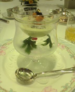 某ホテルのシェフ泣かせのグルメの会なぜなら、元料理長であるホテルの社長がお客様のひとり。^^;ここでしか食べられないメニューが並びます!^^MENUは。。。■アボカドとかに肉のクープ(キャビアとうにがのっかかってます)■海の幸と野菜のゼリー寄せ(まるでお弁当のような美しさ)■牛ロースのしゃぶしゃぶコンソメスープ(コンソメにするにはもったないようなやわらかい肉でした)■真鯛と手長えびのポワレ■フォアグラのローストと子羊のペルシャード(フォアグラ、あんまり好きじゃない^^;)■白桃のコンポートとアイスクリーム3種(左の茶色のアイスはなんと麦茶だそうです。味は珈琲でした^^;)他に、スイカのシャーベット(スイカそのものの味でした)とイタリア細麺の和風スタイル(まるでソーメンのようでした)+珈琲+パンこれを2時間かけてゆっくり食べます。う~ん。。。デリシャス!w(゚o゚)wワオ!!