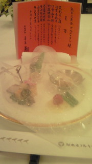 年に1回のお楽しみのグルメの会。今日は、中華でした!^^ベールがかかってておいしそうです。。。ベールをとると・・・?まずは前菜いろいろ・・・グラスにはいってるのは、金賞をとった料理人さんが作ったものだとか?まいうぅー次はホタテ貝柱の香り蒸しホタテが柔らかくておいしくて。。。まいうぅー五目野菜の和牛ロース炒めは、画像ないけど、これもまいうぅー特上フカヒレのキヌガサ茸包みキヌガサ茸にフカヒレをつめたものなの。ほんとにおいしかった。。。活車エビのXO醤炒めアワビとハタのかに肉あんかけ牛テールと烏骨鶏のスープと麻婆豆腐(サプライズ)いちじくのデザートあぁ~おいしかった!^^