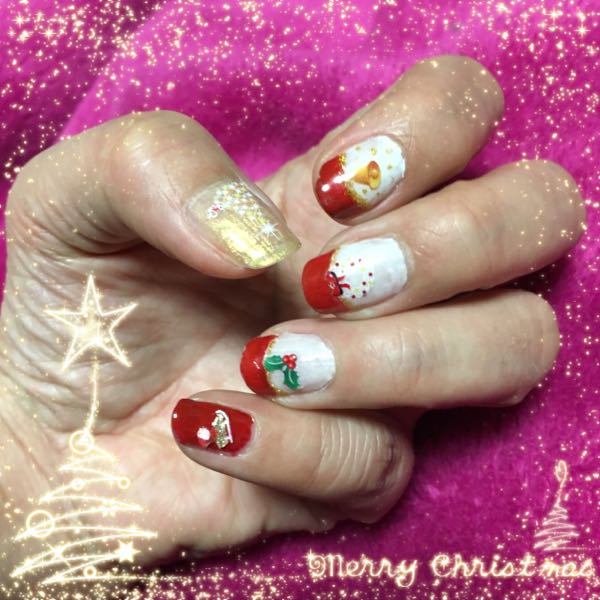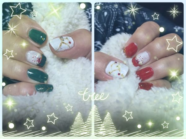 赤も緑も使いたいという欲張りのネイル(笑)左右指で変えてみました意外に好評www