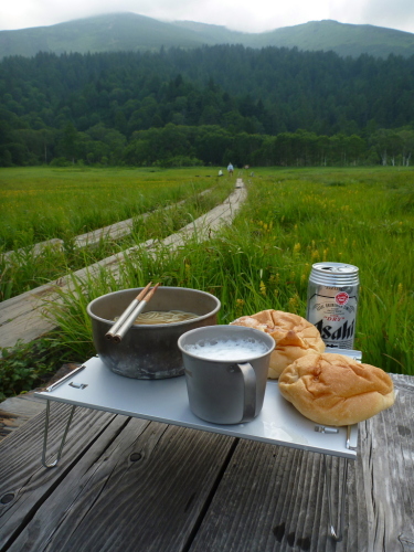 活動の活力のため大事な食事の筈だけれど 今回の尾瀬行は、今年初のテント泊(予算逼迫のため・笑) テント泊だと夜の行動など、ほかの人のに気兼ねなく行動できるので自由だ 食事を作るのは面倒なので簡単なものしか食べないのだけれど 食べる場所にはこだわりを持っている 今までは尾瀬植物研究見本円の第一ベンチを私専用のオープンテラスとして使っていたのだけれど 拠水林が近くてこの時期、蝦が多いことに気が付いて 第三ベンチに引っ越した。 快適 最近朝夕の行動が多いので、カ、ヌカカ、ブユなどに刺され放題で体中大変なことになっているのだ(笑) 4日夕食 至仏山を眺めながら、ビールも飲んで至福の一時 これだけは山小屋の食事では出来ない特権 食事の中身は棒ラーメンとパンだけどね。 この後、逆さ燧に夕焼けを見に ホタルのチェック 尾瀬ヶ原第一ベンチに星を見に 自由に尾瀬ヶ原を闊歩した 5日朝食 3時半に起き朝焼け期待して逆さ燧へ 帰ってきて「時間ねー」と言いながらも ドリップコーヒー落としてオープンテラスに パン と ドライマンゴー と コーヒー 天気も良く最高!! 良い一日になりそうだ みんなの尾瀬を みんなで守り みんなで楽しむ -------------------------------------------------------------------------尾瀬の入り口戸倉温泉 「マルイ旅館」アットホームな雰囲気がお気に入り、尾瀬トレッキングの疲れも大浴場で癒せます。旅館専用の体育館もあり夏合宿にも最適ですよ。自然に触れ、自然を学ぶ、嬬恋軽井沢自然倶楽部みんなの尾瀬を みんなで守り みんなで楽しむ身近な自然の中で生きものを見つけ、その体験を通して生命の大切さに気づき、豊かな感性を育む・・・私たち「赤城姫を愛する集まり」は、この貴重なヒメギフチョウがいつまでも赤城山に舞い続けられる事を願う者の集まりですこのブログのホームに戻る