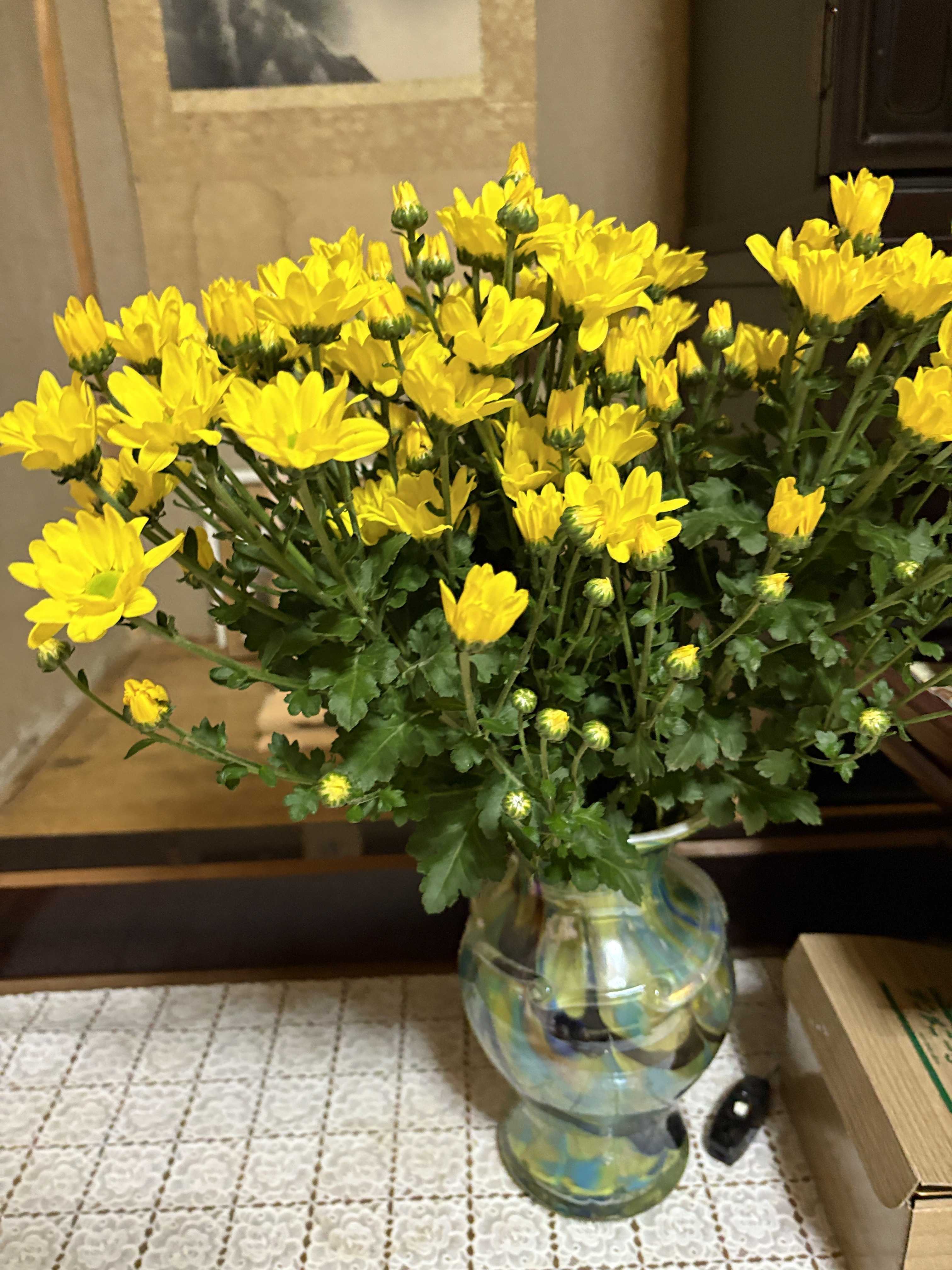 何でも茎が曲がっているため商品にならないらしいです。一生懸命育ててこんなにキレイに咲いているのに商品にならないとはきびしいですね😱早速仏間に飾らせていただきました。ありがとうございます😊 切り花 大菊 5本 お色おまかせ 切花 生花 箱売り 【JF】 [切り花/大菊5本]