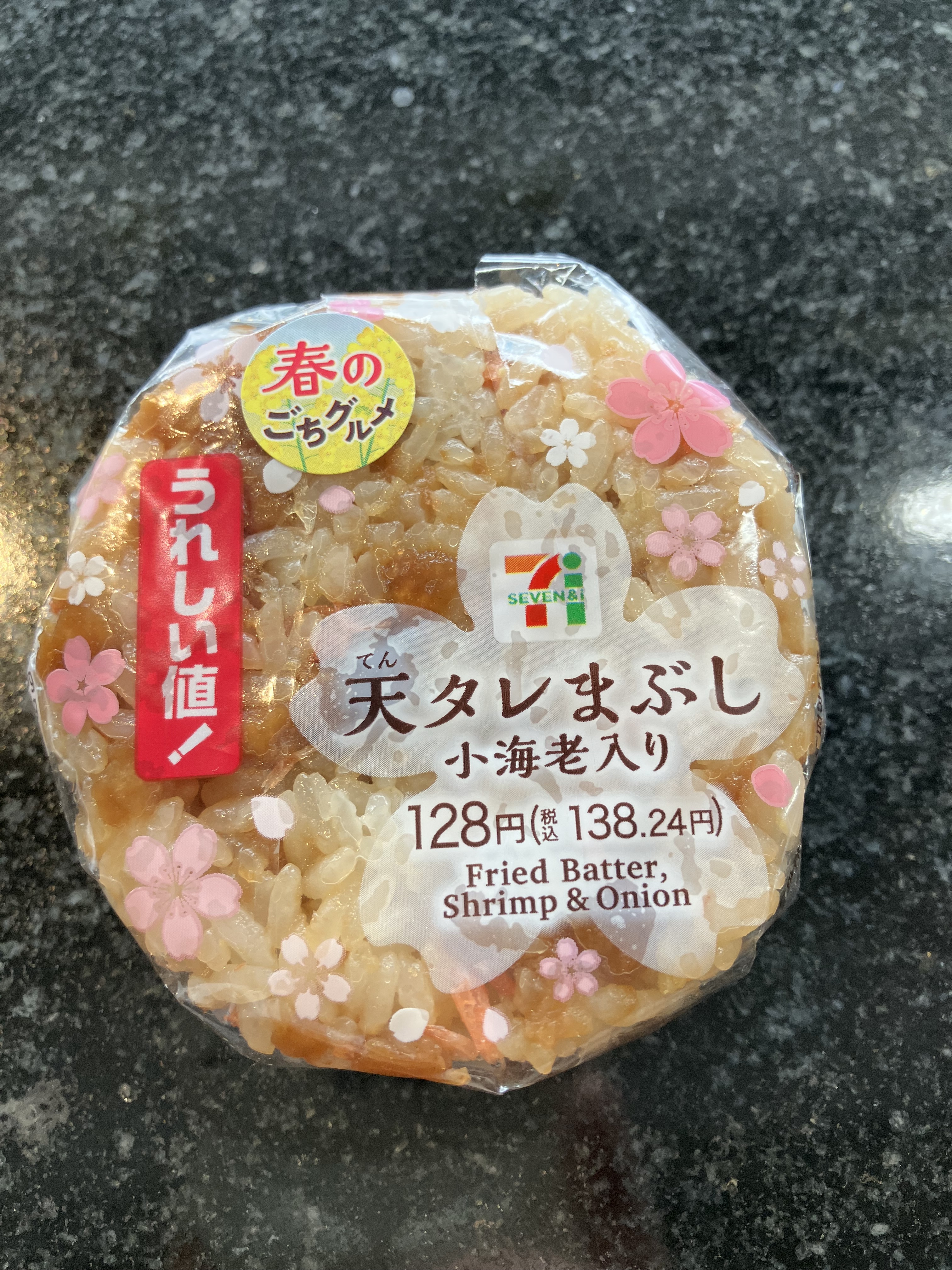 今日のお昼はセブンイレブン天タレまぶし小海老入り春ですね🌸セブンイレブンアプリのクーポン10円引き使用で税込127円也。