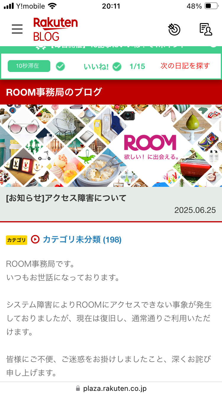 今朝の楽天ROOMがログインできなかったことについてやっぱりアクセス障害だったんだな↓私だけじゃなかったんだな(^_^;)